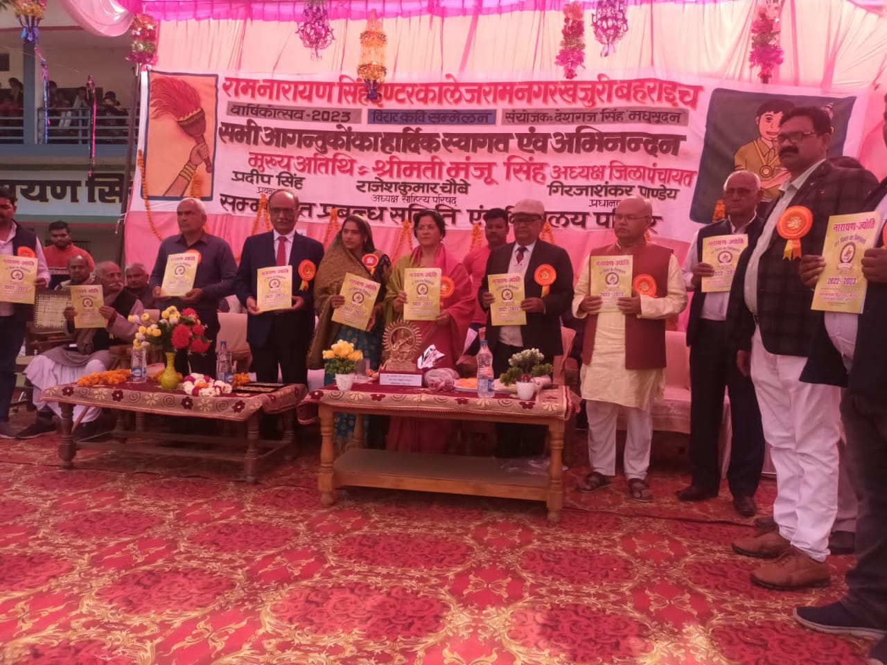 बहराइच (राष्ट्र की परम्परा)l जनपद के पयागपुर राम नारायण सिंह इंटर कालेज राम नगर खजुरी के वार्षिकोत्सव समापन समारोह के अवसर पर वर्तमान जिला पंचायत अध्यक्ष मंजू सिंह द्वारा कार्यक्रम समापन की ओर बढ़ते हुए विद्यालय द्वारा प्रकाशित नारायण ज्योति नामक पत्रिका का विमोचन भी किया गया।विद्यालय के बच्चों द्वारा वार्षिक उत्सव में उत्कृष्ट प्रदर्शन करने वाले विद्यार्थियों को पुरस्कार देकर सम्मानित किया गयाl साथ ही साथ विद्यालय की परम्परा के अनुसार विगत हाईस्कूल 2020 में संतोष कुमार पुत्र पंकज,2021 में मानवी सिंह पुत्री रमेश,2022 में अंकुल यादवपुत्र शिवकुमार, इंटरमीडिएट की परीक्षा 2020 में रितिका सिंह पुत्री दिनेश कुमार,2021 में नानबाबू पुत्र दीना नाथ ,2022 में कीर्ती पुत्री विजय कुमार,अनुसूचित सम्बर्ग 2020 में खुशबू पुत्री राधेश्याम,2021 में वंदना पुत्री रामअचल,2022 में मुकेश पुत्र मुन्ना लाल सर्वोच्च अंक प्राप्त करने वाले बच्चों को पूर्व प्रबंधक डॉ यस यन सिंह माता लक्ष्मी देवी की स्मृति में विद्यालय के वर्तमान प्रबंधक प्रदीप सिंह द्वारा गोल्ड मेडल देकर सम्मानित किया गया। प्रधानाचार्य गिरिजा शंकर पान्डेय ने बताया कि रात्रि में विराट कवि सम्मेलन का आयोजन विगत 10 वर्षों से विद्यालय में निरंतर वार्षिकोत्सव समापन की रात्रि में होता चला आ रहा है इस वर्ष भी है जिसमें दूरदराज के कवियों ने प्रतिभाग किया है।इस अवसर पर विद्यालय के मिथिलेश यादव, हरिओम, राजेश चौबे, राकेश, अमर बहादुर पटेल, अरूण कुमार सहित विद्यालय के सभी अध्यापक, बच्चे व गणमान्य लोग उपस्थित रहे।