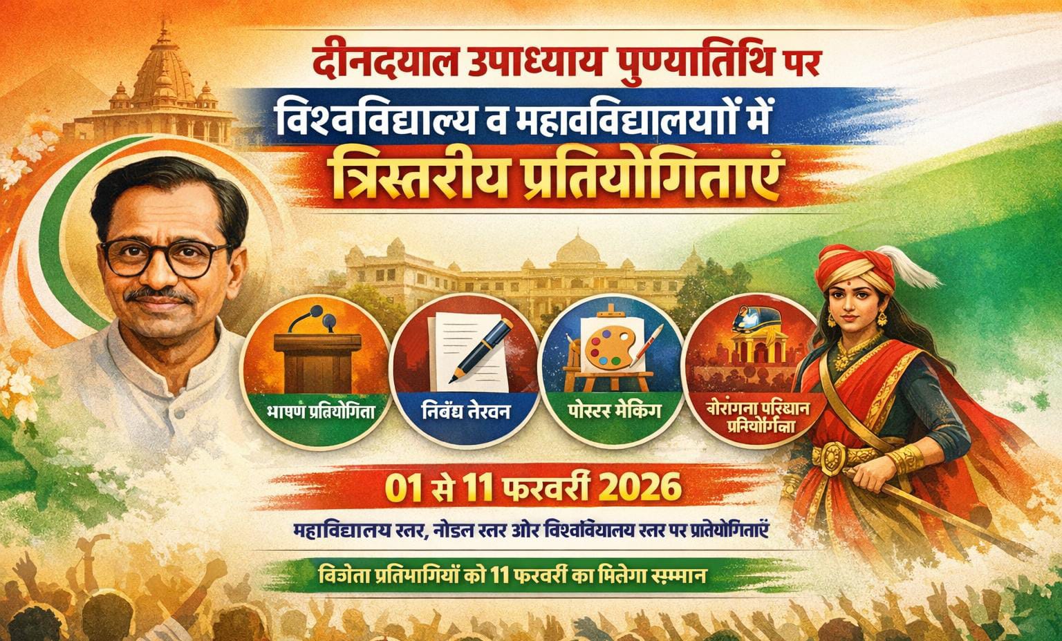 सभी प्रतियोगिताओं के विजयी प्रतिभागियों को 11 फरवरी 2026 को सम्मानित किया जाएगा। दीनदयाल उपाध्याय शोध पीठ की निदेशक प्रो. सुषमा पाण्डेय द्वारा जारी सूचना के अनुसार विश्वविद्यालय प्रशासन ने अधिक से अधिक विद्यार्थियों से सहभागिता की अपील की है।