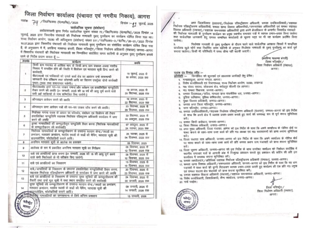 आगरा(राष्ट्र की परम्परा)जिलाधिकारी/जिला निर्वाचन अधिकारी (पंचायत) अरविन्द मल्लप्पा बंगारी ने आगामी त्रिस्तरीय पंचायत सामान्य निर्वाचन की तैयारी के क्रम में निर्वाचक नामावलियों (मतदाता सूची) के वृहद पुनरीक्षण की संशोधित समय सारिणी जारी की है।राज्य निर्वाचन आयोग, उत्तर प्रदेश के निर्देशानुसार यह कार्यवाही सम्पूर्ण जनपद में कराई जाएगी। इसके लिए समस्त उपजिलाधिकारी/सहायक निर्वाचक रजिस्ट्रीकरण अधिकारी (पंचायत), तहसीलदार/अतिरिक्त सहायक निर्वाचक रजिस्ट्रीकरण अधिकारी तथा खण्ड विकास अधिकारी/समन्वयक अधिकारी को नामित किया गया है।निर्वाचक नामावली पुनरीक्षण की प्रमुख तिथियाँ इस प्रकार हैंः29 सितम्बर, 2025 तक: बी.एल.ओ. द्वारा घर-घर जाकर गणना व सर्वेक्षण तथा हस्तलिखित पाण्डुलिपि तैयार करना। (01 जनवरी, 2025 को 18 वर्ष की आयु पूर्ण करने वाले सभी अर्ह व्यक्तियों को शामिल किया जाएगा।)22 सितम्बर, 2025 तक : ऑनलाइन आवेदन की अवधि।23 से 29 सितम्बर, 2025 तक : ऑनलाइन प्राप्त आवेदन पत्रों की घर-घर जाकर जाँच।30 सितम्बर से 06 अक्टूबर, 2025 तक : परिवर्तन, संशोधन एवं विलोपन की हस्तलिखित पाण्डुलिपि तैयार कर सहायक निर्वाचक रजिस्ट्रीकरण अधिकारी को जमा करना।