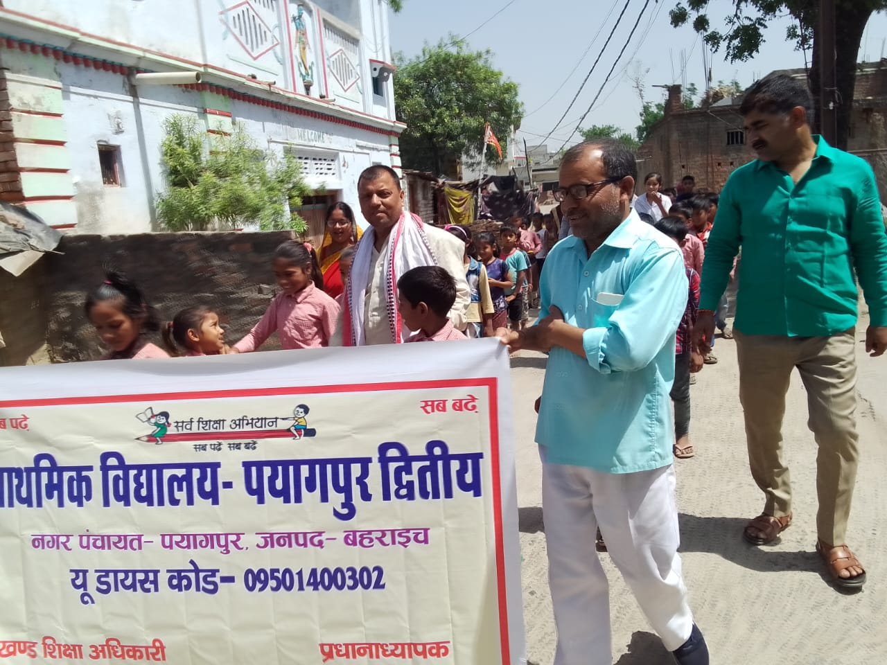 बहराइच (राष्ट्र की परम्परा) । पयागपुर विकास खण्ड के अन्तर्गत प्राथमिक विद्यालय पयागपुर द्वितीय के शिक्षकों ने मतदाता जागरूकता अभियान व स्कूल चलो अभियान के तहत रैली निकालकर अभिभावकों को जागरूक किया,कार्यक्रम में शिक्षकों व अभिभावको ने बढ़-चढ़कर प्रतिभाग किया।कार्यक्रम का शुभारंभ पयागपुर विकास क्षेत्र के एआरपी राजेश कुमार मिश्र व पवन कुमार मिश्र ने संयुक्त रूप से किया, रैली में शिक्षकों के साथ शामिल बच्चों ने शिक्षा जागरूकता सम्बन्धी नारे लिखे स्लोगन, व स्कूल चलो अभियान के लिये अभिभावकों को प्रेरित किया ।शिक्षकों व बच्चों द्वारा निकाली गई जागरूकता रैली में शिक्षकों ने प्रेरणादाई गीतों के माध्यम से अभिभावकों को आगामी चुनाव कैसरगंज लोकसभा निर्वाचन क्षेत्र में प्रतिभाग करने के लिये जागरूक किया जहां पर आये हुऐ अतिथियों के प्रति आभार व्यक्त करते हुये प्रधानाध्यापक विनोद कुमार पांडेय ने कहा कि शासन के निर्देश पर जिला बेसिक शिक्षा अधिकारी अब्यक्त राम तिवारी व खण्ड शिक्षा अधिकारी वीरेन्द्र नाथ द्विवेदी के निर्देश के क्रम में यह अभियान निरन्तर चलाया जा रहा है बच्चों को स्कूल आने के लिये व अधिक से अधिक मतदान प्रतिशत बढ़ाने के लिये जागरूकता रैली निकाली गई थी जहां पर विजयलक्ष्मी सिंह ऊषा पाठक हनुमान प्रसाद राजेन्द्र प्रसाद उमा देवी सुशीला शीला रमेश दिनेश कौशल्या उमा मुन्नी देवी सहित तमाम अभिभावक व छात्र-छात्राएं मौजूद रहे।