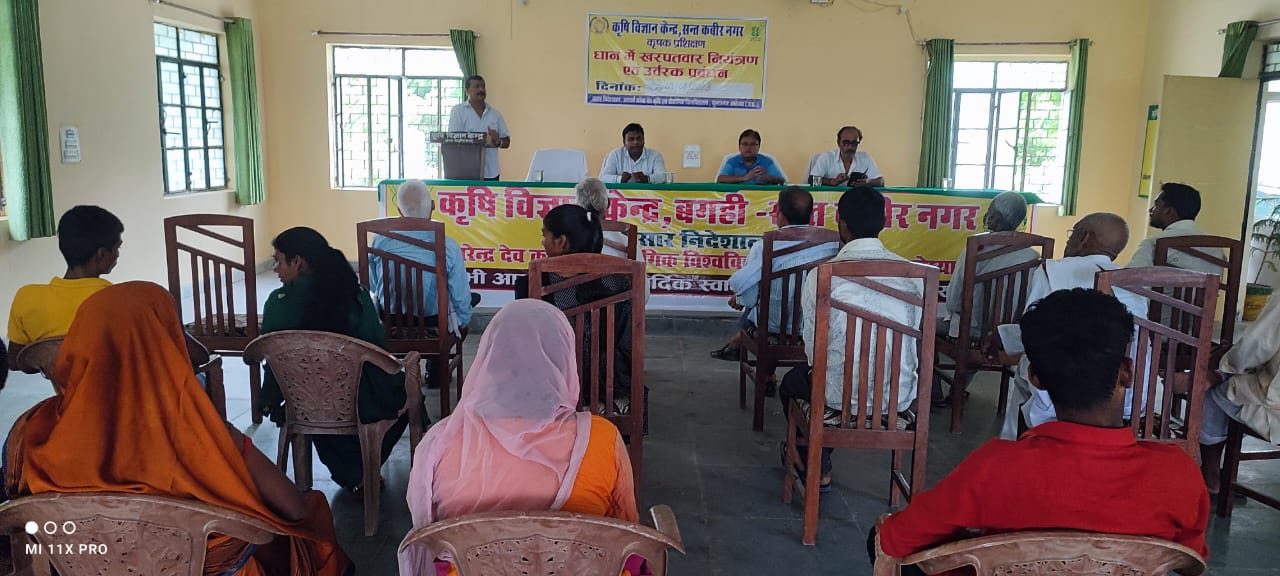 संत कबीर नगर (राष्ट्र की परम्परा)। आचार्य नरेंद्र देव कृषि एवं प्रौद्योगिक विश्वविद्यालय कुमारगंज, अयोध्या के अधीन संचालित कृषि विज्ञान केंद्र बगही में कृषि प्रसार अनुभाग द्वारा धान की फसल में खरपतवार नियंत्रण एवं उर्वरक प्रबंधन तकनीक विषयक दो दिवसीय प्रशिक्षण 8 एवं 9 अगस्त 2023 को आयोजित किया गया। कृषक प्रशिक्षण कार्यक्रम का समापन कृषि विज्ञान केंद्र के वरिष्ठ वैज्ञानिक एवं अध्यक्ष डॉ. अरविंद कुमार सिंह द्वारा किया गया।