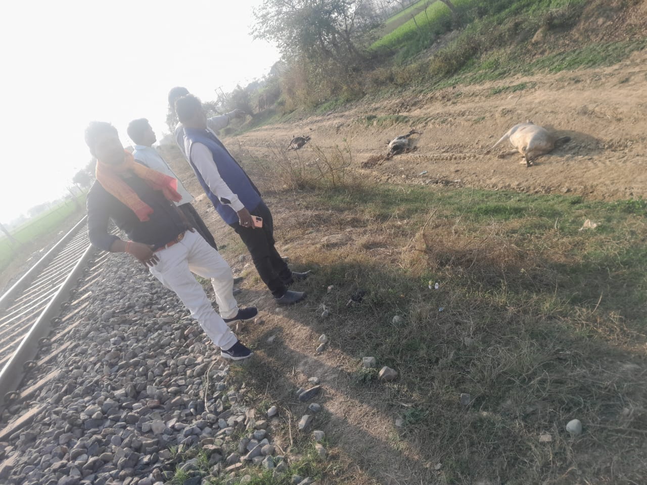 दो दिन पूर्व उझानी के गठौना गांव में रेलवे ट्रैक पर दो गाय व एक नंदी महाराज की ट्रेन से कटकर मौके पर ही मौत हो गई।