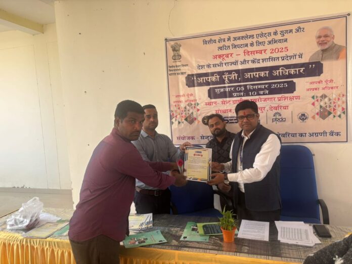 भारत सरकार के वित्त मंत्रालय की पहल पर चलाए जा रहे जागरूकता अभियान के तहत देवरिया में “आपकी पूँजी, आपका अधिकार” शिविर का आयोजन किया गया। सेण्ट ग्रामीण स्वरोजगार प्रशिक्षण संस्थान परिसर में आयोजित इस शिविर में बड़ी संख्या में नागरिकों ने भाग लिया और अपने तथा परिजनों के निष्क्रिय/अनक्लेम्ड खातों की जानकारी प्राप्त की।