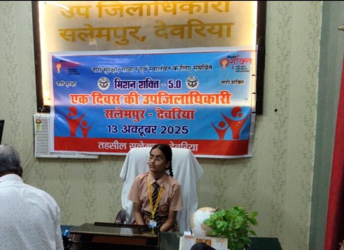 उत्तर प्रदेश सरकार द्वारा महिलाओं की सुरक्षा, सम्मान और सशक्तिकरण को लेकर चलाए जा रहे मिशन शक्ति फेज-5 अभियान के अंतर्गत सोमवार को एक अनोखी पहल देखने को मिली। इस अभियान के तहत मझौली राज वार्ड नंबर 7 निवासी श्री पाण्डेय पुत्री रवि प्रकाश पाण्डेय, जो कि कक्षा 10वीं की छात्रा हैं, को एक दिन का उपजिलाधिकारी (एसडीएम) बनने का अवसर प्रदान किया गया।