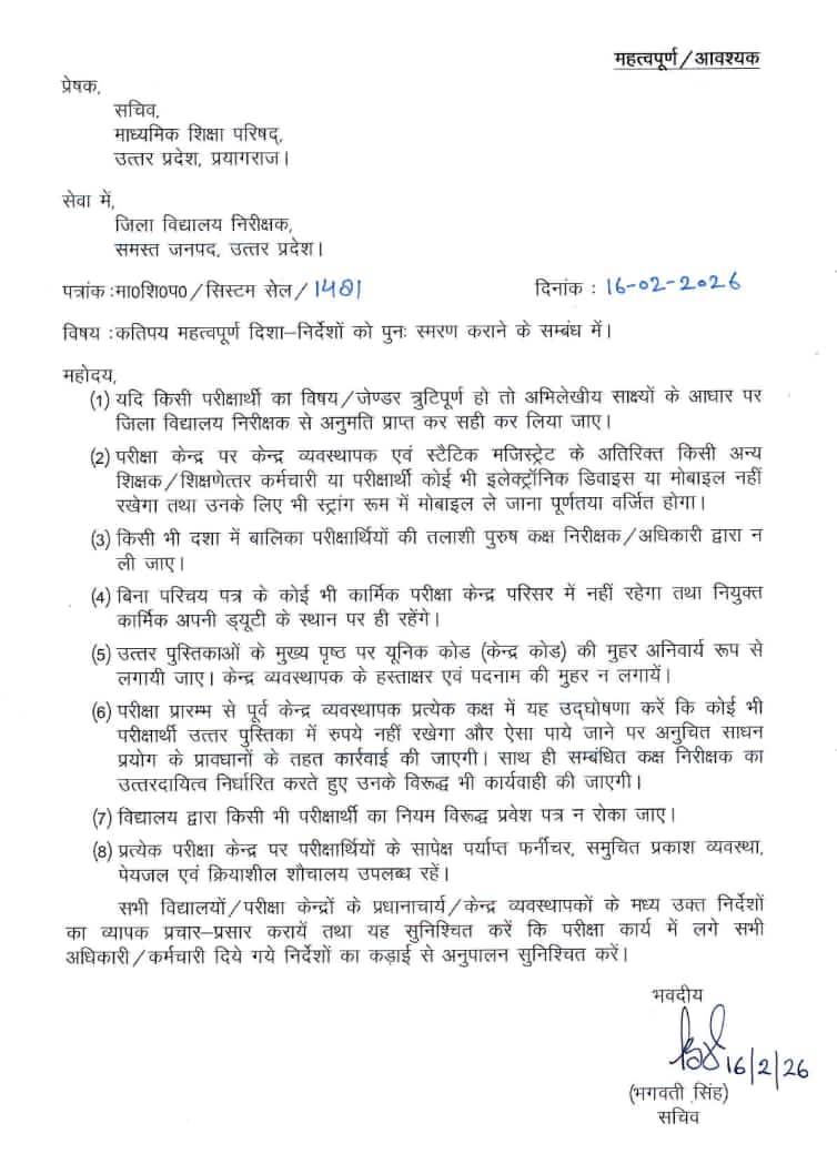 परीक्षा अवधि के दौरान कंट्रोल रूम से सभी जनपदों की गतिविधियों की निगरानी की जाएगी। किसी भी आपात स्थिति, अव्यवस्था या अनुचित गतिविधि की सूचना तत्काल साझा कर आवश्यक निर्देश जारी किए जाएंगे। इससे यह सुनिश्चित किया जाएगा कि यूपी बोर्ड परीक्षा 2026 शांतिपूर्ण, निष्पक्ष और तनावमुक्त वातावरण में संपन्न हों।
