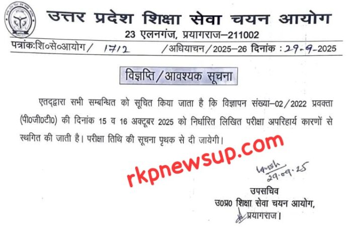 प्रयागराज (राष्ट्र की परम्परा डेस्क)। उत्तर प्रदेश शिक्षा सेवा चयन आयोग ने विज्ञापन संख्या–02/2022 प्रवक्ता (पीजीटी) के तहत 15 व 16 अक्टूबर 2025 को प्रस्तावित लिखित परीक्षा को अपरिहार्य कारणों से स्थगित कर दिया है।