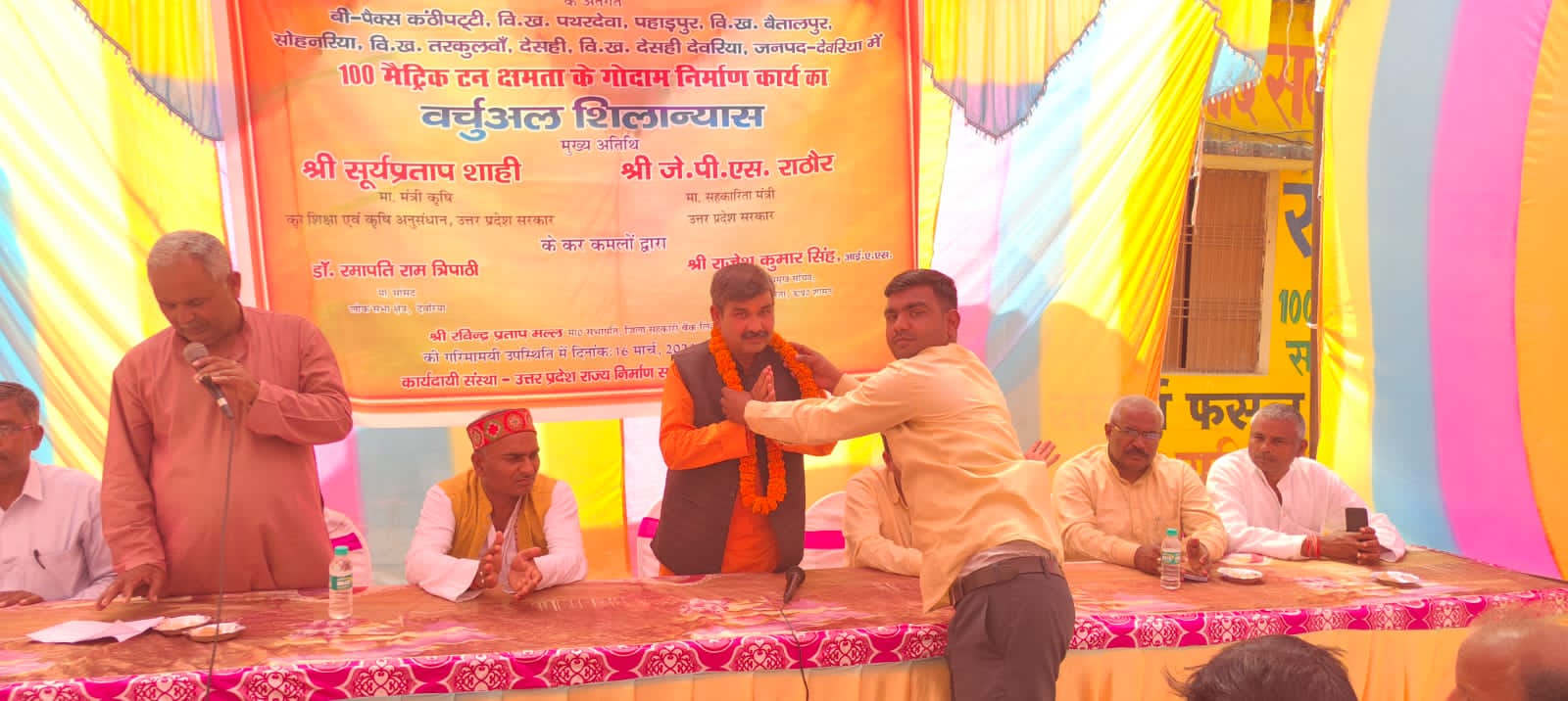 बघौचघाट (राष्ट्र की परम्परा) आर के बी आई योजना अंतर्गत वी पैक्स कन्ठीपट्टी विकास खंड पथरदेवा के कन्ठीपट्टी में शनिवार को राष्ट्रीय कृषि विकास योजना के अंतर्गत 100 मैट्रिक टन क्षमता के गोदाम निर्माण कार्य के वर्चुअल शिलान्यास कार्यक्रम का मुख्य अतिथि जीपीएस राठौर सहकारिता मंत्री उत्तर प्रदेश सरकार द्वारा किया गया। वर्चुअल शिलान्यास कार्यक्रम में रूप मुख्य रूप से हेमन्त पाठक विधानसभा प्रभारी पथरदेवा, जीवन पति त्रिपाठी मंडल अध्यक्ष, रामअशीष गुप्ता ब्लाक प्रमुख तरकुलवा, भीम यादव उपाध्यक्ष सहकारी समिति कन्ठीपट्टी, सहकारी समिति अध्यक्ष संजय कुशवाहा देसही देवरिया, अखिलेश राय पहाड़पुर,ह्दयानारायन शर्मा सोहनरिया, एडीओ सहकारिता पथरदेवा शिवेंद्र विक्रम मौर्य, सचिव राजेश्वर सिंह, डायरेक्टर आनंद यादव, सम्मानित किसान लल्लन सिंह,सदा वृक्ष यादव, अख्तर, पंकज राव, शिवकुमार, संजय राय, विनोद सिंह, रमेश यादव, राजेन्द्र गुप्ता, अभिषेक सिंह,संजय दूबे,बलवंत आदि मौजूद रहे।