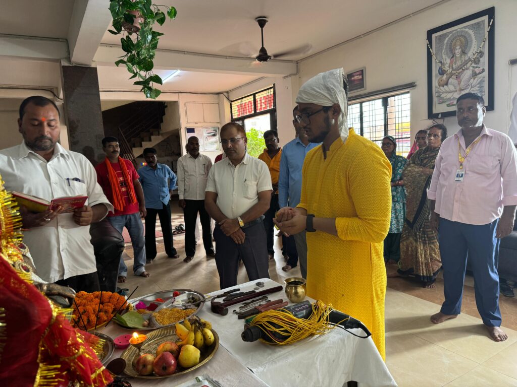 सर्वप्रथम विश्वकर्मा पूजन, अर्चन आदि करने के पश्चात विद्यालय के सभी बसों, जनरेटर, विद्युत उपकरण आदि पर भी पुष्प, अक्षत, रोली,अबीर, चन्दन आदि से पूजा अर्चन किया गया।