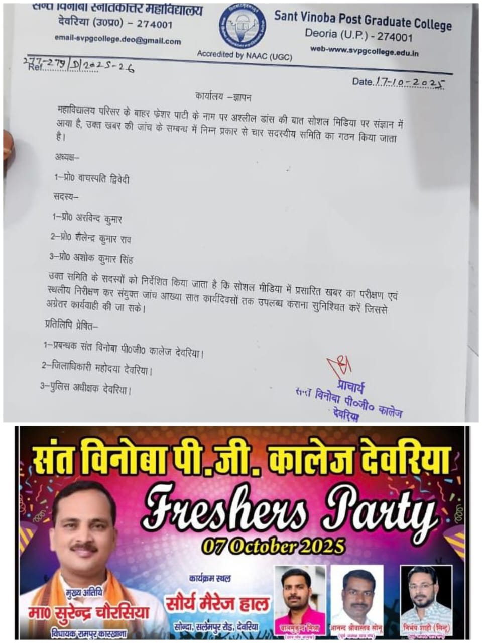 देवरिया के एक प्रतिष्ठित महाविद्यालय के छात्रों ने बिना अनुमति के फ्रेशर पार्टी आयोजित कर सोशल मीडिया पर मचाई सनसनी, कॉलेज प्रशासन ने कहा— “यह अमर्यादित कृत्य संस्थान की छवि को धूमिल करने वाला है।”