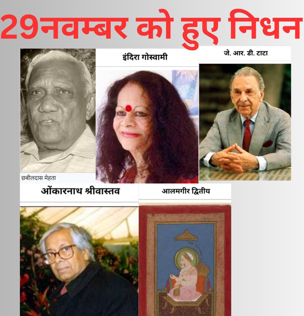 29 नवंबर का दिन भारतीय और विश्व इतिहास में उन महान हस्तियों को याद करने का अवसर है, जिन्होंने अपने ज्ञान, सेवा, साहित्य, राजनीति, उद्योग और समाज परिवर्तन से अमिट छाप छोड़ी। आज हम उन व्यक्तित्वों को नमन करते हैं जिनका 29 नवंबर को निधन हुआ और जिन्होंने अपने-अपने क्षेत्रों में अमर योगदान दिया।
