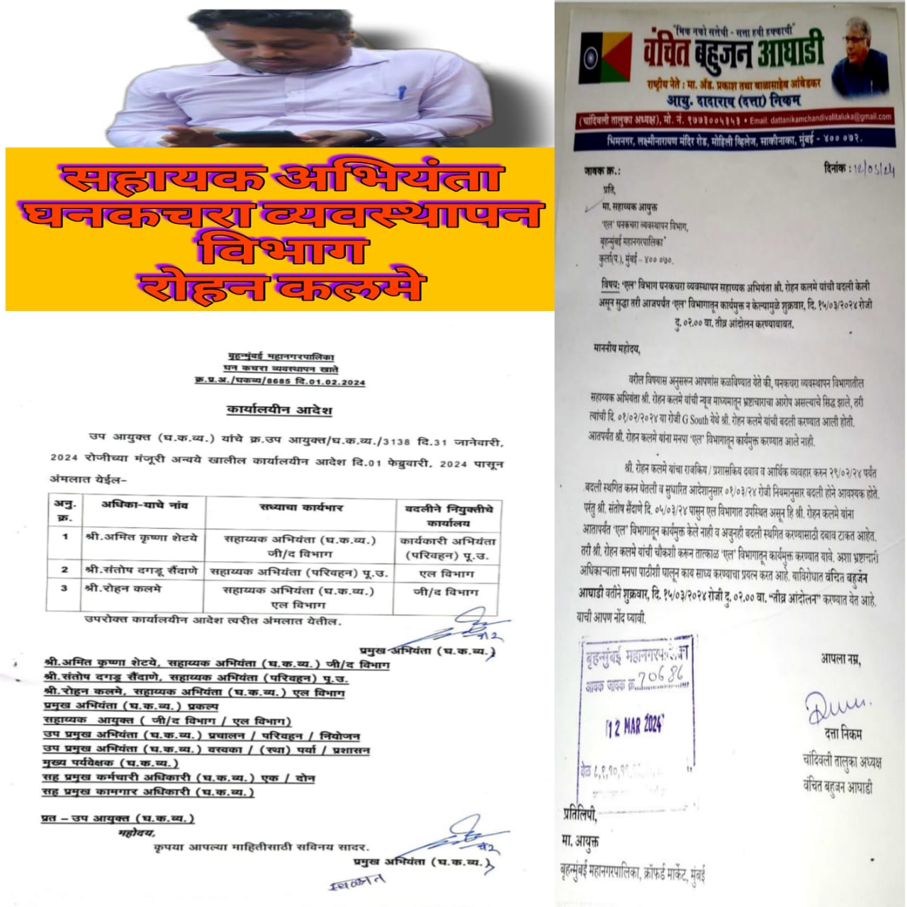 देश की सबसे श्रीमंत मानी जाने वाली मुंबई महानगरपालिका पर बार बार और भ्रष्टाचार के आरोप लगाए जाते हैं। कई मनपा के अधिकारी विभाग में पिछले कई वर्षों से डटे पड़े हुए हैं। जबकि महानगरपालिका के अनुसार अधिकारियों के तीन वर्ष के बाद रूटिंन बदली कर दी जानी चाहिए। मुंबई मनपा के कुर्ला के एल वार्ड के अंतर्गत घन कचरा व्यवस्थापन विभाग के सहायक अभियंता रोहन कलमें का पिछले 2 महीनो के भीतर दो बार तबादला हुआ है। दोनों ही बार दूसरे विभाग का अधिकारी रोहन कलमें के स्थान पर आया । उसने चार्ज भी लिया लेकिन रोहन कलमे ने चार्ज नहीं छोड़ा और वह अधिकारी पहली बार बैरंग लौट गया और दूसरी बार पिछले एक हफ्ते से वार्ड में बैठा हुआ है, लेकिन रोहन कलमें को रिलीज नहीं किया जा रहा है। बता दे की महानगरपालिका में कर्मचारियों की कमी है, उसके बावजूद ही एक भी एक ही पोस्ट दो दो अधिकारियों को बैठाकर मनपा द्वारा मनुष्य बल का गलत इस्तेमाल किया जा रहा है। अब ऐसे में यह चर्चा है कि क्या मुंबई मनपा के अंदर ट्रांसफर का अवैध रूप से कारोबार चलाया जा रहा है, क्योंकि रोहन कलमें पर स्थानीय नागरिकों ने कई बार भ्रष्टाचार का भी आरोप लगाया है और भ्रष्टाचार का आरोप लगने के बाद ही उसका दो बार तबादला किया जा चुका है। शिकायतकर्ताओं का दावा है कि राजनीतिक दबाव की वजह से रोहन कलमें का तबादला रोक दिया जाता है जो कि मनपा कानून के गलत इस्तेमाल का ज्वलंत उदाहरण है। इस संदर्भ में शिकायतकर्ता विनोद सोनकांबले ने आरोप लगाया है कि भीलवाड़ा के सहायक आयुक्त धनाजी हेर्लेकर रोहन कलमे पर विशेष रूप से मेहरबान है। वे यह नहीं चाहते कि रोहन कलमें का तबादला किसी अन्य वार्ड में हो। क्योंकि रोहन कलमें उनके लिए एक कमाऊ पूत है। इसीलिए पिछले 10 दिनों से रोहन कलमे का रिलीज ऑर्डर उनके टेबल पर रखा हुआ है लेकिन वह साइन नहीं कर रहे हैं। इस संदर्भ में प्रतिक्रिया लेने के लिए सहायक आयुक्त धनजी हेर्लेकर से संपर्क करने की बार-बार कोशिश की गई लेकिन उन्होंने फोन नहीं उठाया, इसलीये शुक्रवार 15-03-2024 को दोपहर 2 बजे वंचित बहुजन आघाडी (चांदीवली विधानसभा )का एल विभाग मनपा पर दोपहर 2 बजे तीव्र आंदोलन का इशारा किया गया है।