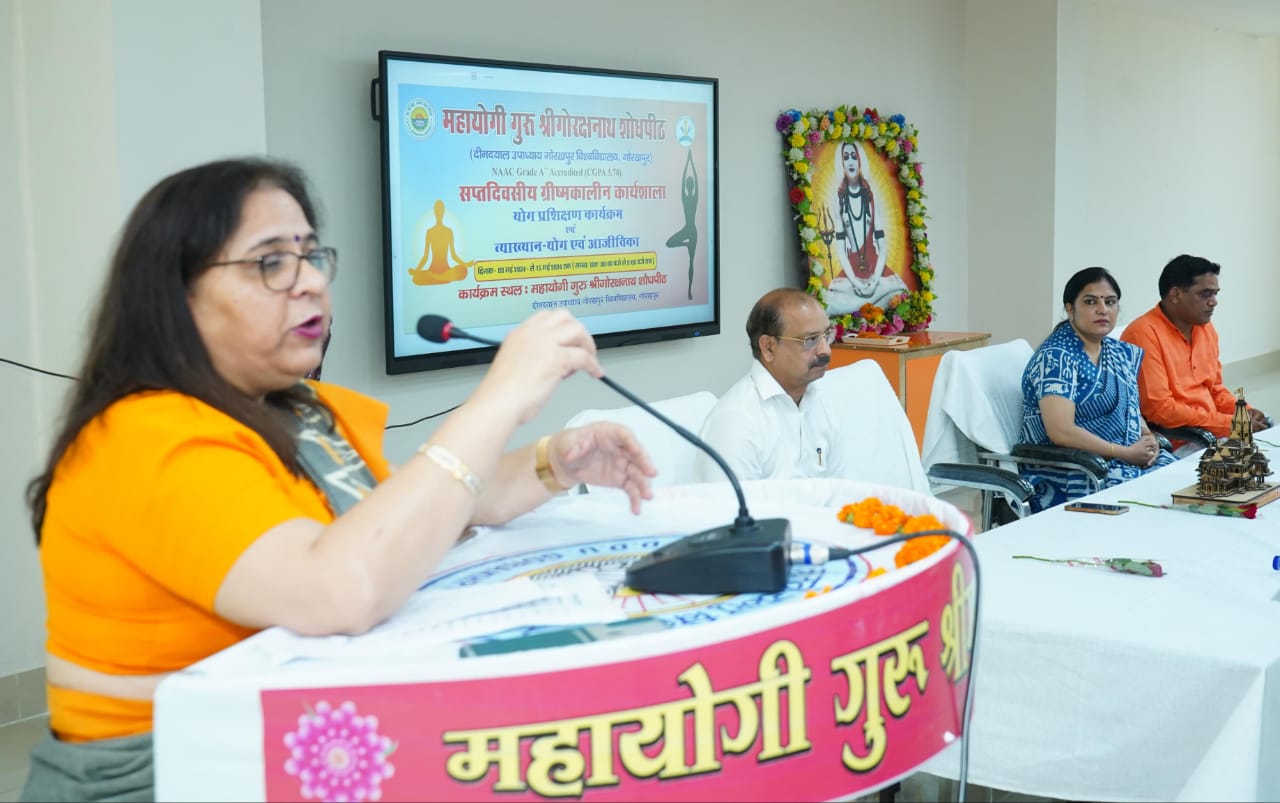 गोरखपुर (राष्ट्र की परम्परा)। दीनदयाल उपाध्याय गोरखपुर विश्वविद्यालय स्थित महायोगी गुरु श्रीगोरक्षनाथ शोधपीठ द्वारा कुलपति प्रो. पूनम टण्डन के संरक्षण में चल रहे सप्तदिवसीय ग्रीष्मकालीन कार्यशाला ’योग एवं आजीविका’ सातवें एवं अंतिम दिन सम्पन्न हो गया। कार्यशाला के अंतिम दिन भी सुबह डा. विनय कुमार मल्ल के द्वारा योग प्रशिक्षण दिया गया। उसके बाद 10 बजे मुख्य वक्ता प्राणि विज्ञान के पूर्व विभागाध्यक्ष प्रो. दिनेश कुमार सिंह द्वारा योग एवं मानव जीवन विषय पर व्याख्यान दिया गया। उन्होंने अपने व्याख्यान में कहा कि मानव जीवन के तीन आयाम है शरीर, मन एवं आत्मा। इन तीनों से योग जुड़ा हुआ है। जब तक वैचारिक शुद्धता नहीं होगी तब तक कोई किसी को योग नहीं सिखा सकता। उन्होंने यम एवं नियम के महत्त्व पर विशेष जोर दिया।