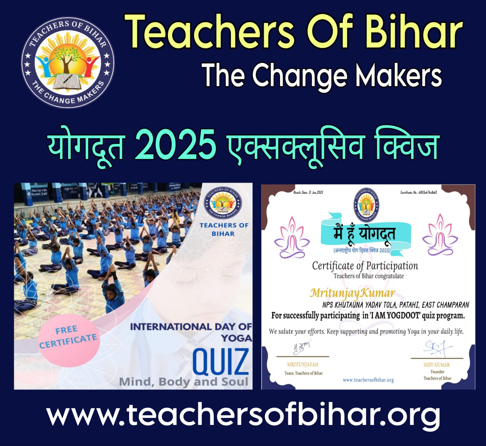 इस योग दिवस को खास बनाने के लिए बिहार की सबसे बड़ी प्रोफेशनल लर्निंग कम्युनिटी ” टीचर्स ऑफ बिहार ” ने आयोजित किया “योगदूत 2025 एक्सक्लूसिव ऑनलाइन क्विज प्रतियोगिता”।